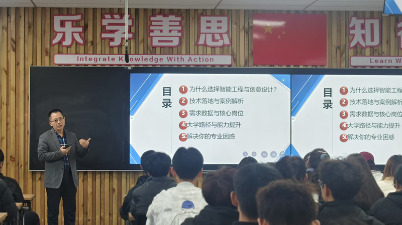 讲座开始前,由智能工程学院党总支书记孟书记主持,孟书记对吕教授进行了详细的介绍,讲座的气氛瞬间活跃起来。讲座伊始,吕宗旺教授以从日常生活中的智能家居入手,生动的分享了智能工程与创意设计领域的前沿成果,从AI驱动的工业设计自动化系统,到日常智能家居的变革,生动展现了“智能+创意”融合催生的行业变革。当前社会对兼具技术素养与创新思维的复合型人才需求激增。吕教授结合市场调研数据,深入剖析了社会需求与就业前景:从智能装备研发、交互设计到智慧空间规划,相关岗位需求年均增长超20%,且薪资水平、职业发展空间显著优于传统领域,为新生们勾勒出清晰的职业蓝图。